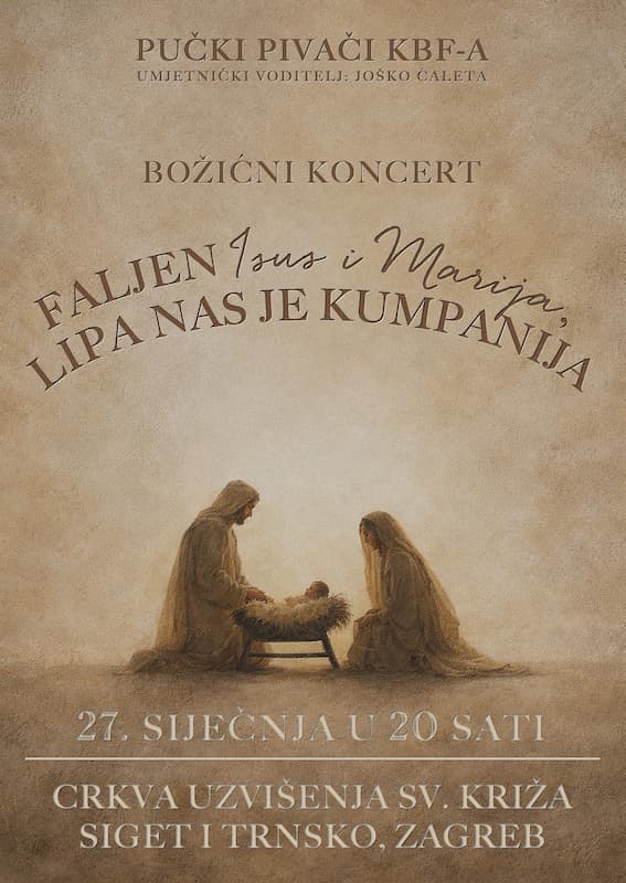 * U utorak 27. siječnja u 20 sati u našoj crkvi bit će koncert Pučkih pivača KBF-a. Oni će pod vodstvom gospodina Joška Ćalete izvesti božićni repertoar pod nazivom Faljen Isus i Marija lipa nas je kumpanija.