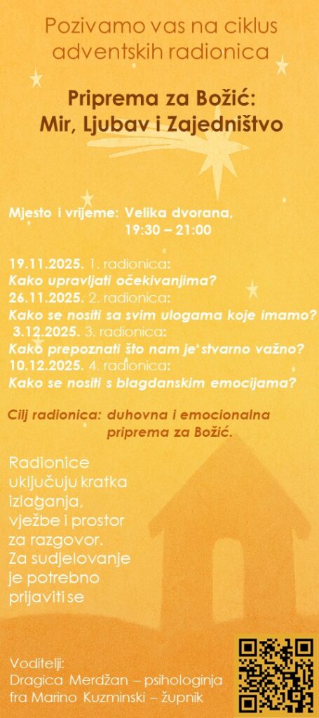 * Zahvaljujem umirovljenicima koji su se odazvali za kavu s fratrima u četvrtak. Voljeli bismo da se takvi susreti nastave pa pozivamo i ovaj četvrtak od 10 do 12 sati umirovljenike koji žele malo druženja uz kavu – dobro došli. Susret je u dvorani Milosrdnog Isusa – ulaz sa sjeverne strane ispod stepeništa crkve.